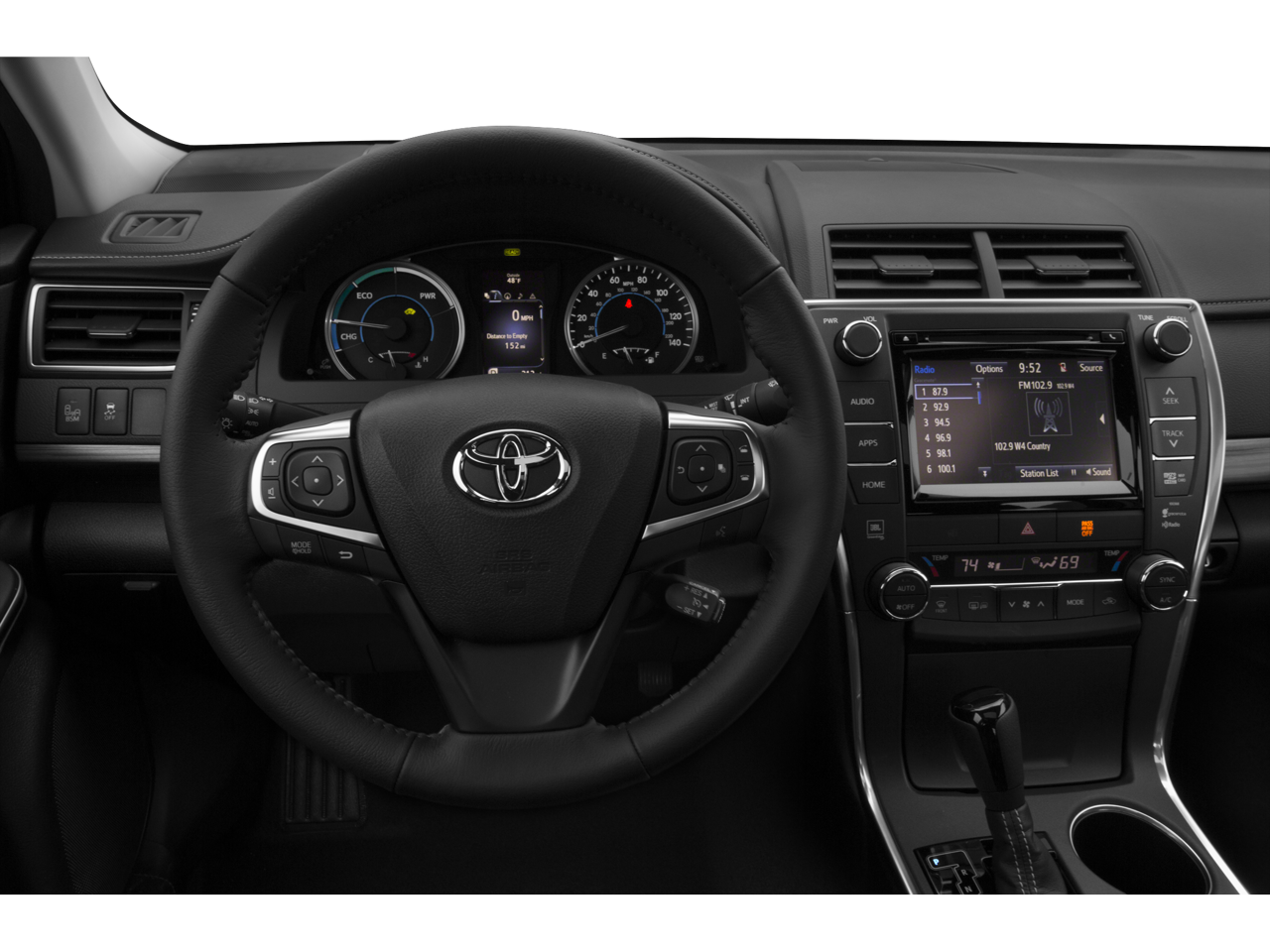 This 2015 Toyota Camry Hybrid LE in Attitude Black includes the following features: 2.5L I4 Hybrid DOHC eCVT FWD Camry Hybrid LE, 4D Sedan, 2.5L I4 Hybrid DOHC, eCVT, FWD, Attitude Black, ABS brakes, Electronic Stability Control, Front dual zone A/C, Heated door mirrors, Illuminated entry, Low tire pressure warning, Remote keyless entry, Traction control, 4-Wheel Disc Brakes, 6 Speakers, Air Conditioning, AM/FM radio, Automatic temperature control, Brake assist, Bumpers: body-color, CD player, Delay-off headlights, Driver door bin, Driver vanity mirror, Dual front impact airbags, Dual front side impact airbags, Exterior Parking Camera Rear, Fabric Seat Trim, Four wheel independent suspension, Front anti-roll bar, Front Bucket Seats, Front Center Armrest, Front reading lights, Fully automatic headlights, Knee airbag, Occupant sensing airbag, Outside temperature display, Overhead airbag, Overhead console, Panic alarm, Passenger door bin, Passenger vanity mirror, Power door mirrors, Power driver seat, Power steering, Power windows, Radio data system, Radio: Entune Audio, Rear anti-roll bar, Rear seat center armrest, Rear side impact airbag, Rear window defroster, Speed control, Speed-sensing steering, Split folding rear seat, Steering wheel mounted audio controls, Telescoping steering wheel, Tilt steering wheel, Trip computer, Variably intermittent wipers, and Wheels: 7.0J x 16 Steel. Recent Arrival!