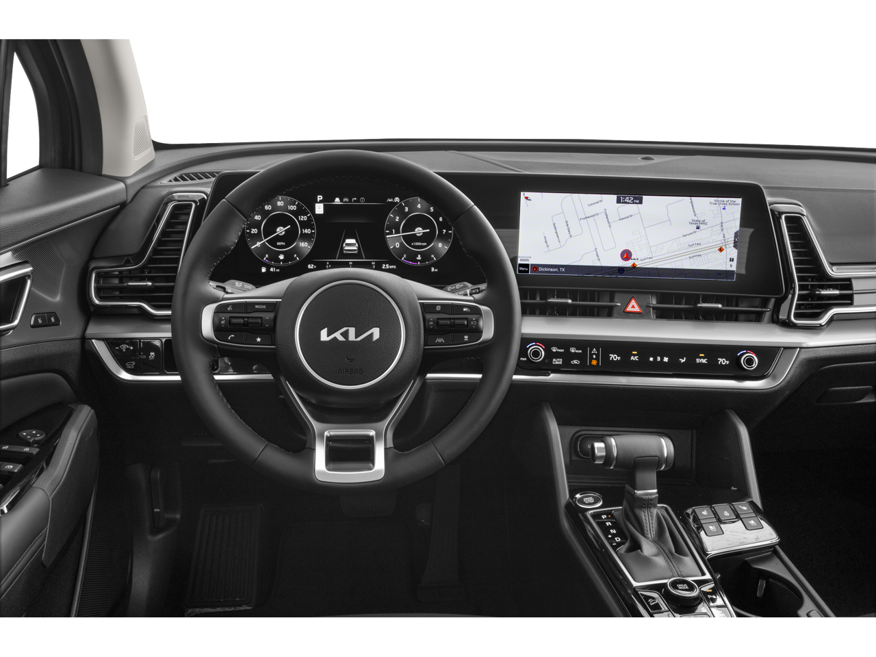 This 2024 Kia Sportage SX-Prestige in Glacial White Pearl includes the following features: I4 8-Speed Automatic FWD Sportage SX-Prestige, 4D Sport Utility, I4, 8-Speed Automatic, FWD, Glacial White Pearl, Black Artificial Leather, 4-Wheel Disc Brakes, 8 Speakers, ABS brakes, Air Conditioning, Alloy wheels, AM/FM radio: SiriusXM, Apple CarPlay & Android Auto, Auto High-beam Headlights, Automatic temperature control, Axle Ratio: 3.648, Brake assist, Bumpers: body-color, Cargo Mat, Cargo Net Hybrid w/Audio, Carpeted Floor Mats, Compass, Delay-off headlights, Driver door bin, Driver vanity mirror, Dual front impact airbags, Dual front side impact airbags, Electronic Stability Control, Emergency communication system, Four wheel independent suspension, Front anti-roll bar, Front Bucket Seats, Front Center Armrest, Front dual zone A/C, Front fog lights, Front reading lights, Fully automatic headlights, harman/kardon® Speakers, Heated & Ventilated Front Bucket Seats, Heated door mirrors, Heated front seats, Heated steering wheel, Illuminated entry, Leather Shift Knob, Leather steering wheel, Low tire pressure warning, Memory seat, Navigation System, Occupant sensing airbag, Outside temperature display, Overhead airbag, Overhead console, Panic alarm, Passenger door bin, Passenger vanity mirror, Power door mirrors, Power driver seat, Power Liftgate, Power moonroof, Power passenger seat, Power steering, Power windows, Premium Leatherette Seat Trim, Radio: AM/FM/HD Audio System, Rain sensing wipers, Rear anti-roll bar, Rear reading lights, Rear seat center armrest, Rear side impact airbag, Rear window defroster, Rear window wiper, Remote keyless entry, Security system, Speed control, Speed-sensing steering, Split folding rear seat, Spoiler, Steering wheel mounted audio controls, Tachometer, Telescoping steering wheel, Tilt steering wheel, Traction control, Trip computer, Turn signal indicator mirrors, Variably intermittent wipers, Ventilated front seats, and Wheels: 19 Gloss Black Alloy. 25/33 City/Highway MPG