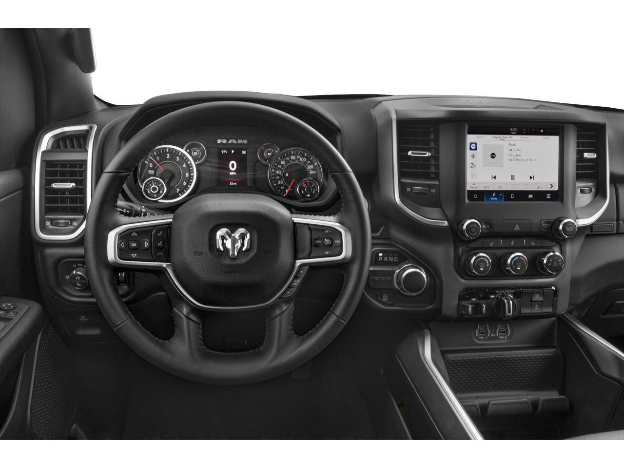 This 2024 Ram 1500 Big Horn/Lone Star in Diamond Black includes the following features: HEMI 5.7L V8 Multi Displacement VVT eTorque 8-Speed Automatic RWD Big Horn Level B Equipment Group (115V Auxiliary Power Outlet, 2nd Row In Floor Storage Bins, 400W Inverter, 4G LTE Wi-Fi Hot Spot, 9 Amplified Speakers w/Subwoofer, Air Conditioning ATC w/Dual Zone Control, All R1 High Radios, All Radio Equipped Vehicles, Apple CarPlay, Auto-Dimming Exterior Driver Mirror, Auto-Dimming Rear-View Mirror, Black Premium Power Mirrors, Class IV Receiver Hitch, Cluster 7.0 TFT Color Display, Connected Travel & Traffic Services, Connectivity - US/Canada, Convex Wide-Angle Exterior Mirror Insert, Exterior Mirrors Courtesy Lamps, Exterior Mirrors w/Heating Element, Exterior Mirrors w/Supplemental Signals, For Details, Visit DriveUconnect.com, For More Info, Call 800-643-2112, Front Fog Lamps, Global Telematics Box Module (TBM), Glove Box Lamp, Google Android Auto, GPS Navigation, HD Radio, Heated Front Seats, Heated Steering Wheel, Integrated Voice Command w/Bluetooth®, LED Footwell Lighting, Media Hub w/2 Charge Only USBs, ParkSense Front/Rear Park Assist w/Stop, Power 2-Way Driver Lumbar Adjust, Power 8-Way Driver Seat, Power Adjustable Pedals, Power-Folding Mirrors, Radio: Uconnect 5 Nav w/12.0 Display, Rear Dome w/On/Off Switch Lamp, Rear Power Sliding Window, Rear Window Defroster, Remote Start System, Security Alarm, SiriusXM Radio Service, SiriusXM w/360L, Sun Visors w/Illuminated Vanity Mirrors, Universal Garage Door Opener, and USB Host Flip), Night Edition (3 Rear Seat Head Restraints, 4 Way Front Headrests, Accent Color Door Handles, Accent Color Premium Power Mirrors, Anti-Spin Differential Rear Axle, Black Exterior Truck Badging, Black Headlamp Bezels, Black Interior Accents, Black Painted Exterior Mirrors Caps, Body Color Front Bumper, Body Color Rear Bumper w/Step Pads, Bucket Seats, Deluxe Cloth Bucket Seats, Dual Exhaust w/Black Tips, Front Seat Back Map Pockets, Full Length Floor Console, Grille Surround 1 Black Texture 2 Black, Manual Adjust 4-Way Front Passenger Seat, RAM Grille Badge - Black, Rear 60/40 Folding Seat, Rear Center Armrest, and Wheels: 20 x 9.0 Premium Paint/Polished), Quick Order Package 27R Lone Star (Regional) (Lone Star Badge), 1500 Big Horn/Lone Star, 4D Crew Cab, HEMI 5.7L V8 Multi Displacement VVT eTorque, 8-Speed Automatic, RWD, Diamond Black, Black Cloth, 3.21 Rear Axle Ratio, 4-Wheel Disc Brakes, 48V Belt Starter Generator, 6 Speakers, ABS brakes, Air Conditioning, Alloy wheels, AM/FM radio, Brake assist, Bumpers: chrome, Cloth Bench Seat, Compass, Delay-off headlights, Driver door bin, Dual front impact airbags, Dual front side impact airbags, Electronic Stability Control, Emergency communication system: RAM Connect, Exterior Parking Camera Rear, Front anti-roll bar, Front Center Armrest w/Storage, Front License Plate Bracket, Front reading lights, Front wheel independent suspension, Fully automatic headlights, Heated door mirrors, Illuminated entry, Leather steering wheel, Low tire pressure warning, MOPAR Front & Rear Rubber Floor Mats, Occupant sensing airbag, Outside temperature display, Overhead airbag, Overhead console, Panic alarm, Passenger door bi